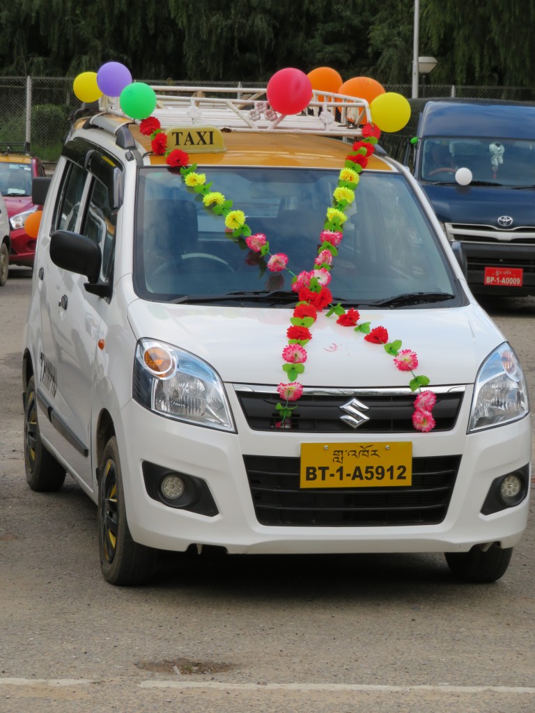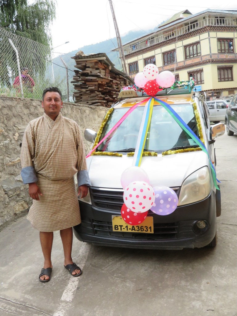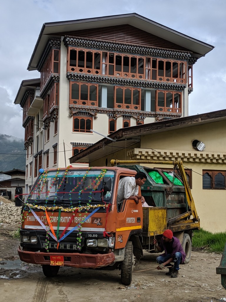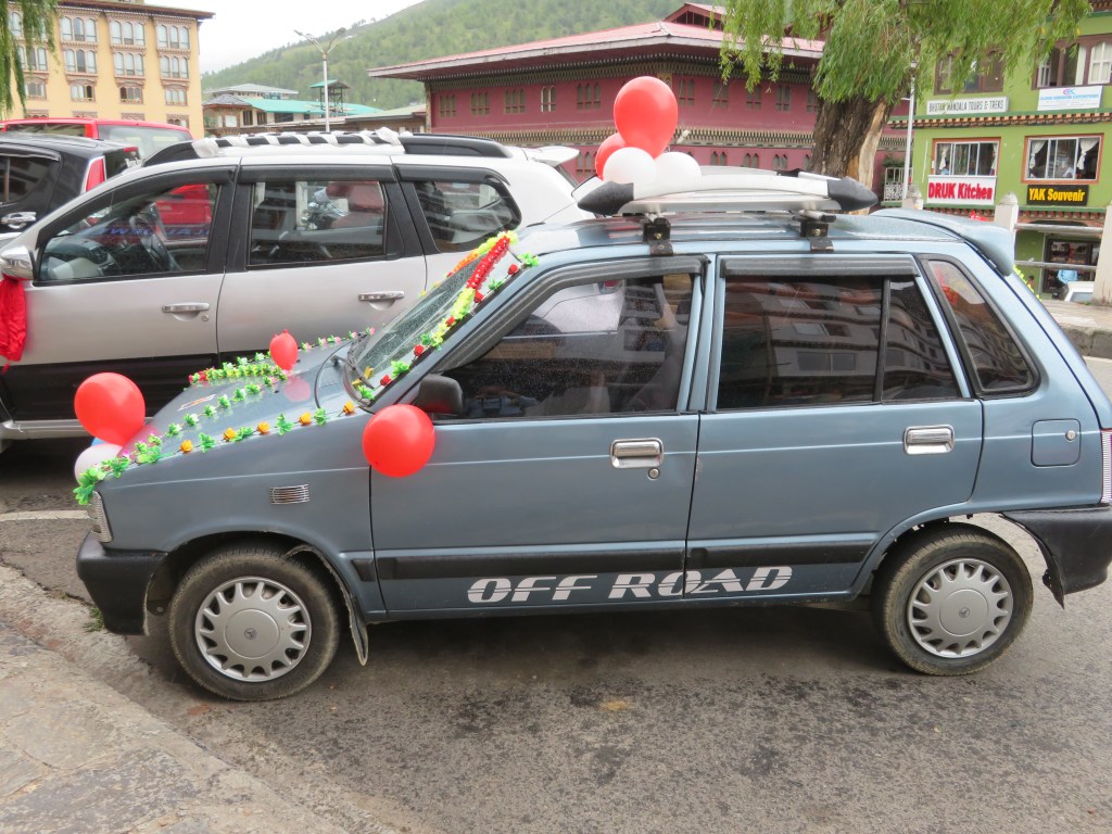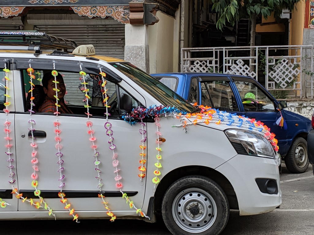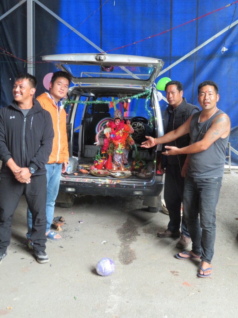 Margaret called from the balcony and was advised to come down once the decoration was completed. We learned it was the holiday of Vishnakarma Pooja. 20% of Bhutanese are Hindu and it appears that nearly every construction worker in Thimphu is Indian and follows the Hindu religion. Celebrations take place throughout the city.