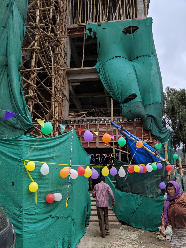Thimpu is exploding in growth. Everywhere you look, new construction is going up and older buildings are being rehabbed for modernization and earthquake protection. Indian laborers toil from dusk to dawn with the most primitive of tools. Vishwakarma Puja is one day for them to take off and to celebrate. Rather than use their tools, they set them aside and worship them. It’s also a day to party and party hard.