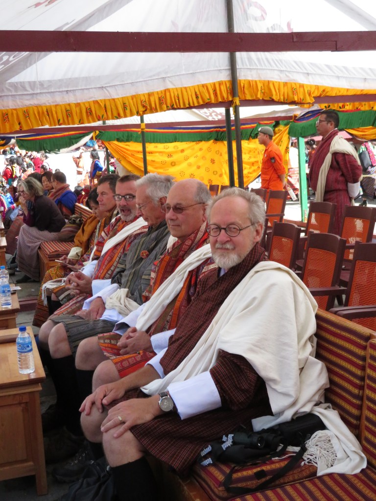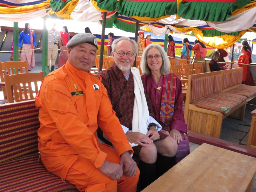 Nema, our benefactor from the Desuung, the Guardians of Peace and Harmony-also known as the King’s Guard. On learning we were HVO volunteers, Nema ensured that we had a place of honor in the VIP tent. While there, we chatted with the Ambassador from Bangladesh, the the charge d’affaires from the Kuwaiti Embassy and his wife (an expert baker), and four builders from Montana on their twelfth visit to Bhutan, building a log style State Guest House and hoping to modernize building methods in Bhutan. Once the guests were seated, the remainder of the tent was opened to other fortunate Tshechu attendees. I know we could not have had the patience and stamina to sit crowded in the rain and sun for the entire Tshechu as thousands of others did. So, we were truly blessed.