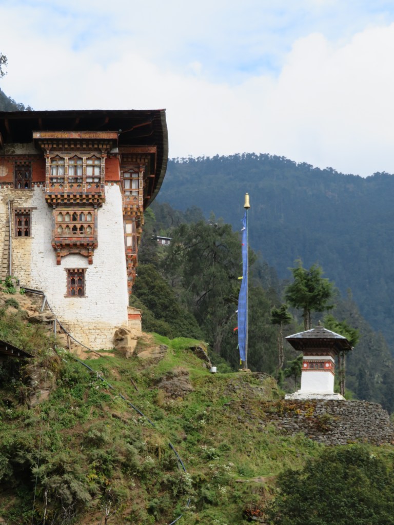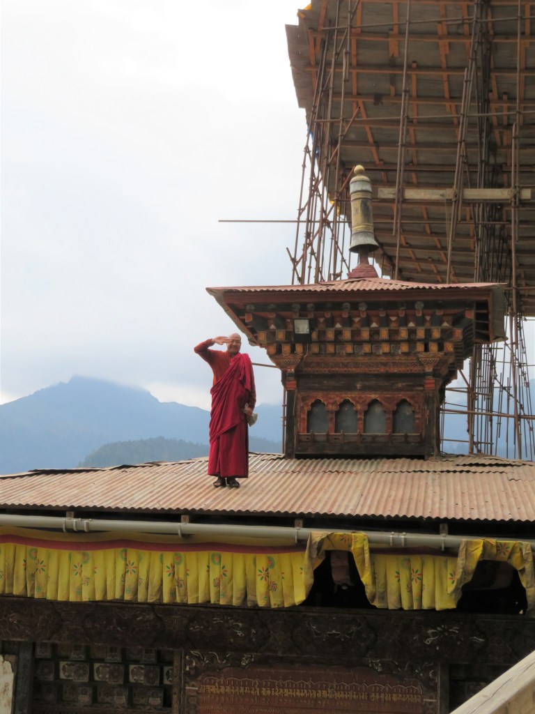 “Young monks in their red robes can always be seen milling around, for Tango is now Bhutan’s main Buddhist Institute, with 200 monks studying there. The hill on which Tango stands is surrounded by little meditation huts, and some of the senior students choose to go into solitary retreat here, traditionally for three years, three months and three days. During this time, the only person they see is their monk-tutor, who brings them food and keeps an eye on their health and welfare. It has to be said that only few are considered emotionally and mentally strong enough to be allowed to go into this long retreat–for it must be a hard thing to commune with one’s innermost self for so long, without any other human contact.”