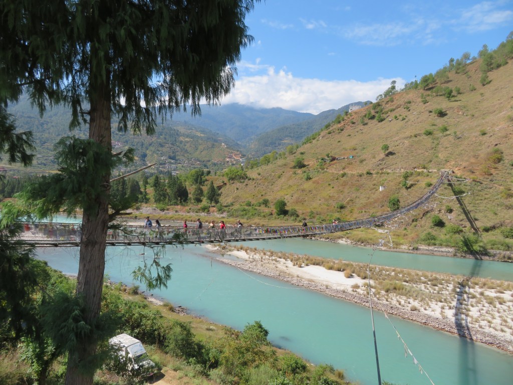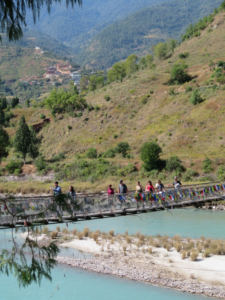 Our first overnight visit to Punakha was documented in our post of October 1st. It was great but there was still plenty left to see and do. This time we arrived in the late afternoon to our hotel after a cordial and informative visit to the Punakha District Hospital and spent two nights, visiting the suspension bridge at the Dzong, the longest in Bhutan, and viewing the confluence of the the Mo Chhu (female) and Pho Chhu (male) rivers as the merge around the Dzong to form the Puna Tsang Chu. We then visited a nunnery and a monastery, and concluding a packed but surprisingly relaxing day, we hiked down from the monastery, past remote farm houses, through rice paddies, buckwheat terraces, corn and grazing land, to return at nightfall to our hotel. The amazing view above is from our balcony.