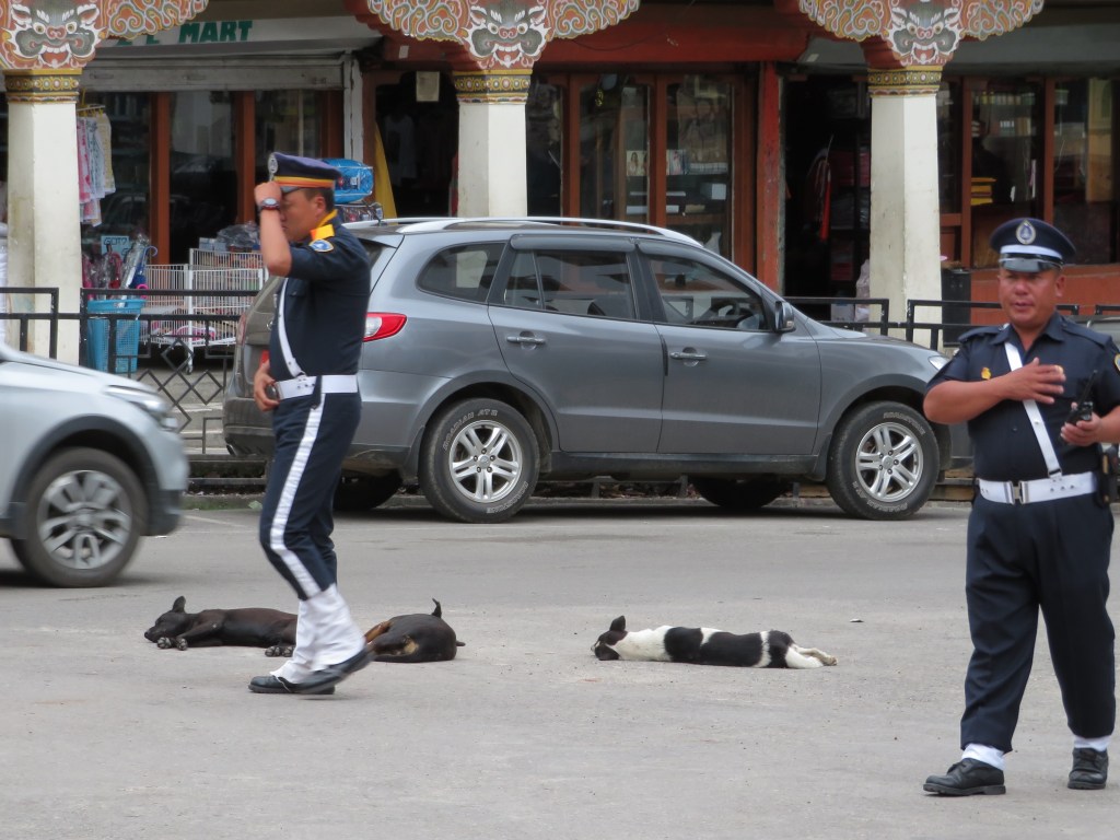 Dogs took rest wherever they wished. Often, here at main intersection of Chorten Lam and Norzin Lam, there would be as many as seven or eight dogs relaxing during rush hour as drivers carefully threaded their way through the challenging canid course. We never once saw an officer shoo them away.