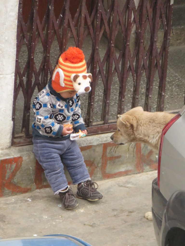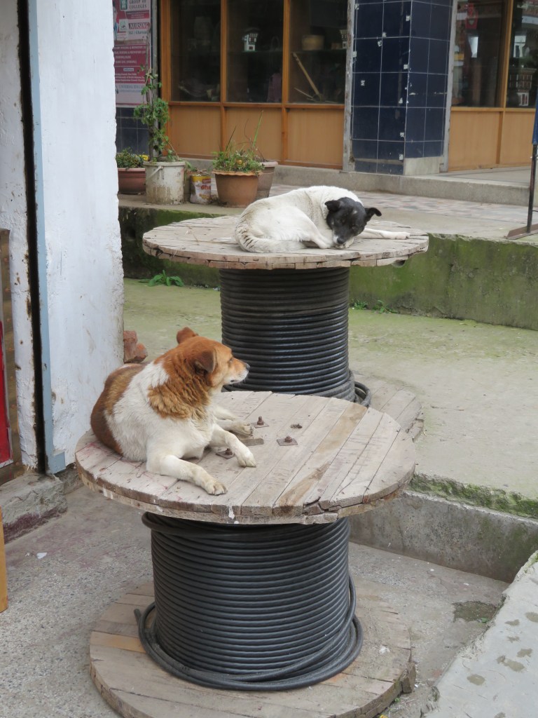In Clocktower Square, nearly all the dogs were small black versions of labs, occasionally with white markings. We kept track of six black puppies there who nursed one day with one mother and with a different one the next, sharing maternal responsibilities. In our neighborhood of Changzumtog, golden retriever genes predominated, maybe with a little chow mixed in. Solar dogs, we learned they were called, sleeping all day in the sun, barking, howling and mixing it up all night long. Somehow the racket was reassuring, lulling us into happy dreams.