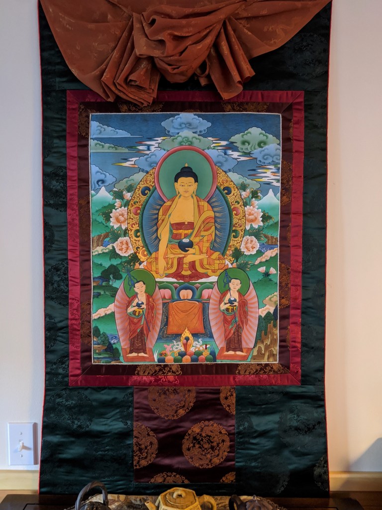 Brocade mounted Thangka painting, now in our study. Needless to say, our suitcases were as heavy and full on leaving as on arriving, despite leaving behind many kg worth of textbooks.