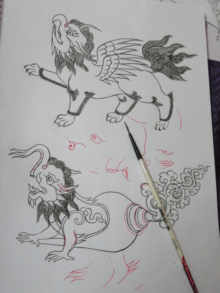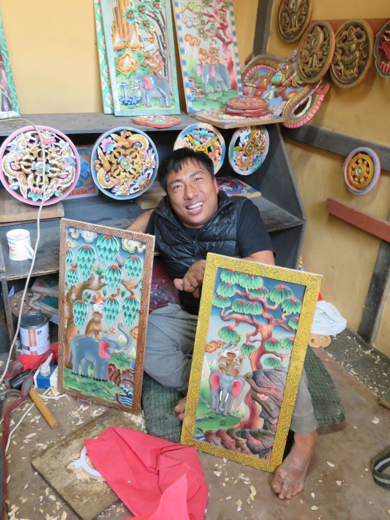 Pema, a remarkable, award winning carver and painter with cerebral palsy. He carves and paints with his feet. These two carvings of the Four Harmonious Friends were brought home for our grandchildren