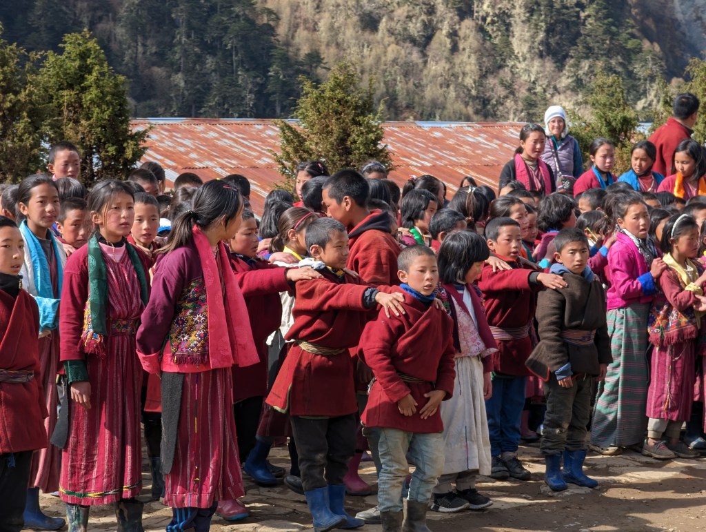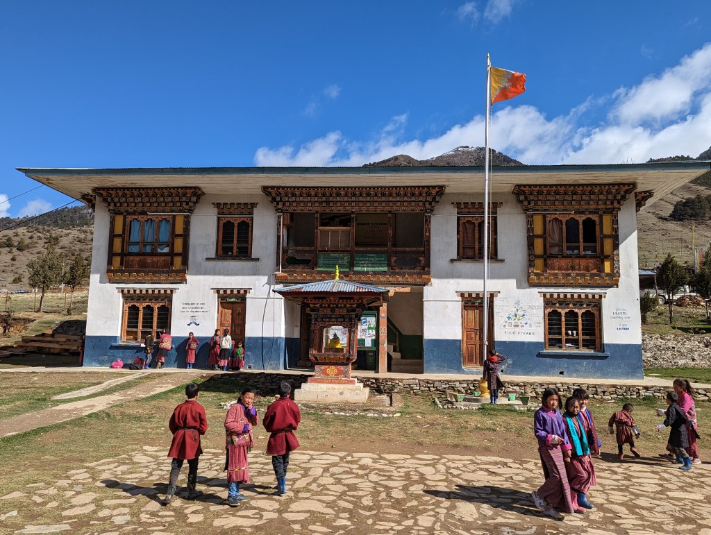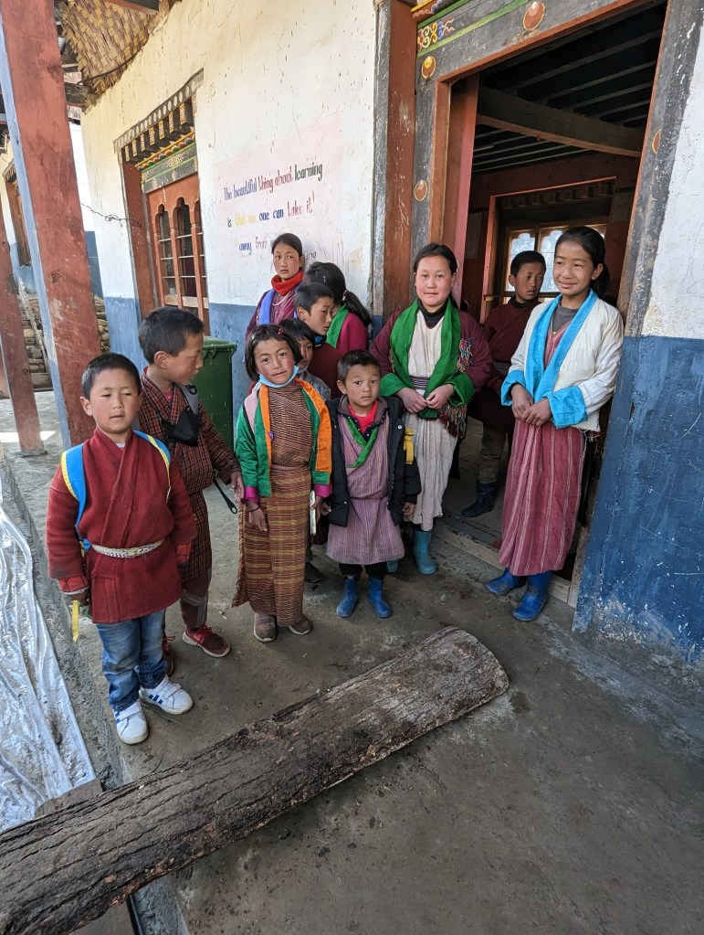 Into the Bolero and our first stop was the school. Approximately 175 students, kindergarten to Class 6 attend. Ninety-five of them are boarders, living at the school all but one month in the winter and one in the summer. This is quite common in Bhutan and I imagine this is a significant contributing factor to the communal spirit we witness everywhere we go. Classes are taught in English and Dzongkha, the two national languages of Bhutan.