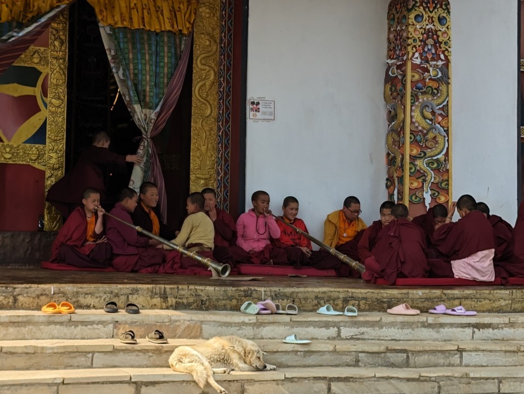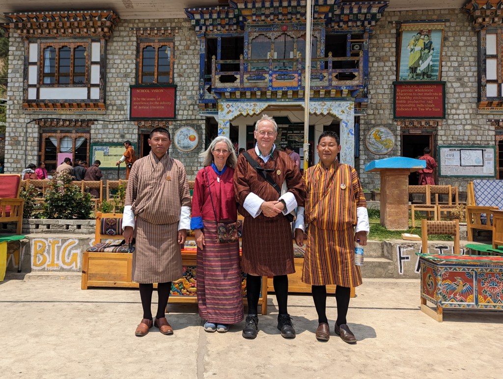 Flanked by the cultural administrator and the school principal, we were treated as surprise guests of honor, with front row seats, milk tea and biscuits. Tang Valley Central School has about 400 students, primarily boarding students. Given the low population density and limited road accessibility, boarding schools are the historical norm in Bhutan. Lasting bonds are built that have played a significant role in decades past unifying the country. An extension of family in a way, it further solidifies a national identity and the importance of community. Out of respect we wore the national dress but, unfortunately, I forgot the sunscreen for my knees. Ouch! The sun at altitude burns quickly.