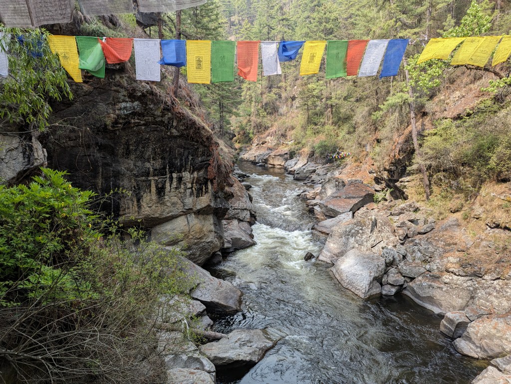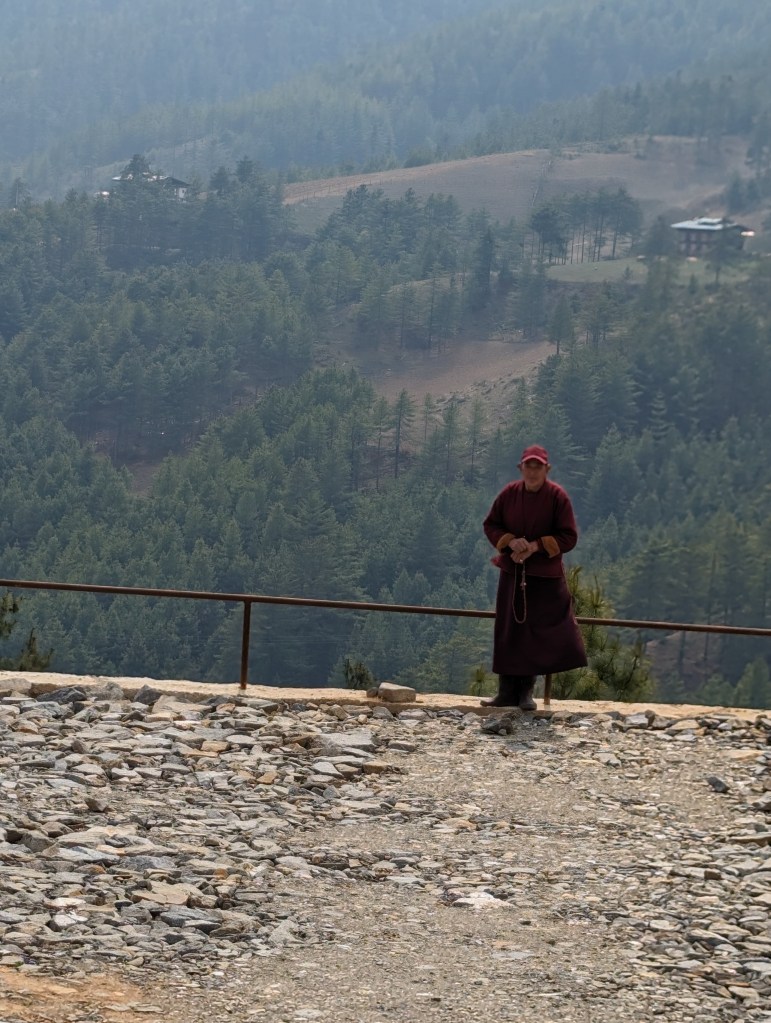 Along the way, we gave a lift to this gentleman. He was concluding a two-month pilgrimage, returning to his meditation cave in the north to start his fourth retreat of three years, three months, three weeks and three days each. In retreat, he will remain throughout each day in prayer and sitting meditation in a cave so small he cannot stand up and sleep at night in a small hut, his only nourishment a single meal of rice per day with an occasional curry. We were happy to share our buckwheat pancakes and a banana with him and he was happy to receive it and to be relieved of a day’s journey by foot. Through our guide, we discussed shared aspects of our respective Buddhist practices. He volunteered to offer prayers and rituals for our rebirth as humans in the time of a Buddha, to move us a bit closer to enlightenment, asserting it to be the only legitimate goal of our life as humans. He also agreed to perform the pertinent rituals for the longevity, good fortune and health of our families.