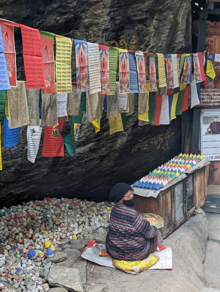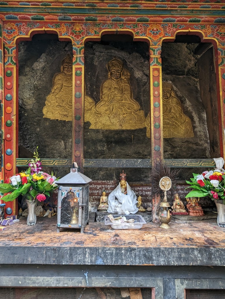 Reading prayers and blessing tsa tsas at the entrance to the burning lake. There is a tunnel to the left of the tsa tsas that one can crawl through to cleanse themselves of sins, but the drop on the other end was a bit too precipitous for our tastes. We’ll try a few extra prayers instead.