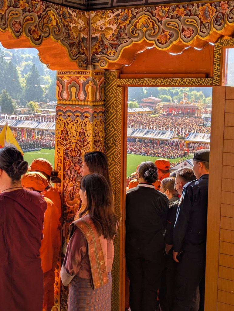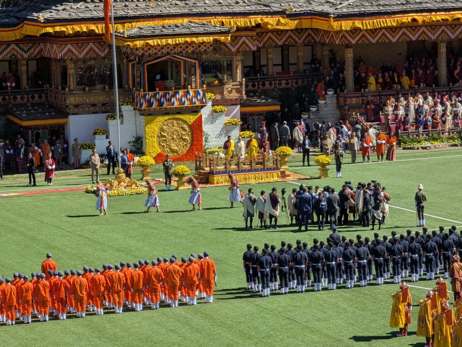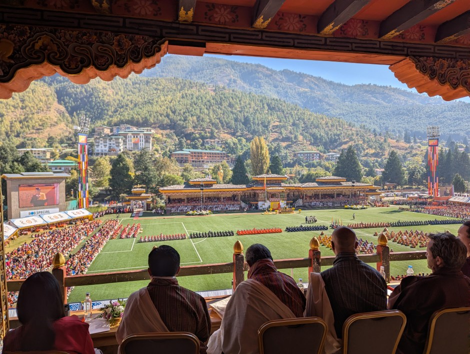 Comfortably seated with the VIPs, we enjoyed Bhutan’s version of a military parade while served tea and snacks. Remarkably, everyone in the stadium received the same commemorative bag as we did, filled with a Bhutanese flag, bottle of water, a portrait pin of the king and snacks.
